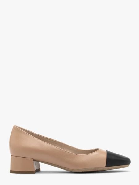Beżowe czółenka damskie z czarnym noskiem na niskim klocku