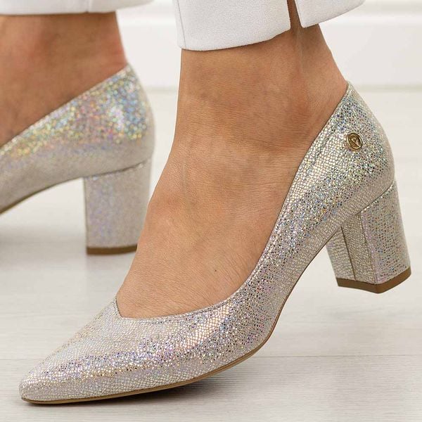 Srebrne multi skórzane Polskie czółenka damskie na obcasie Prestige 2105/OBL