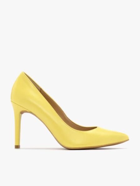 Żółte czółenko na wysokim obcasie z linii ESTIMA.Model wykonany z najwyższej jakości skóry licowej.Podszewka i wyściółka skórzana.Szpilka oblekana o wysokości 9 cm.Wysokość obcasa uśredniona dla rozmiaru 37.Nosek w szpic.