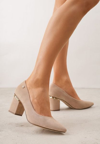 Beżowe Czółenka na Słupku z Wkładką ze Skóry Naturalnej i Metaliczną Ozdobą Dynaste
