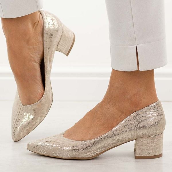 Złote s160 skórzane Polskie czółenka damskie na obcasie Prestige 2235/obl