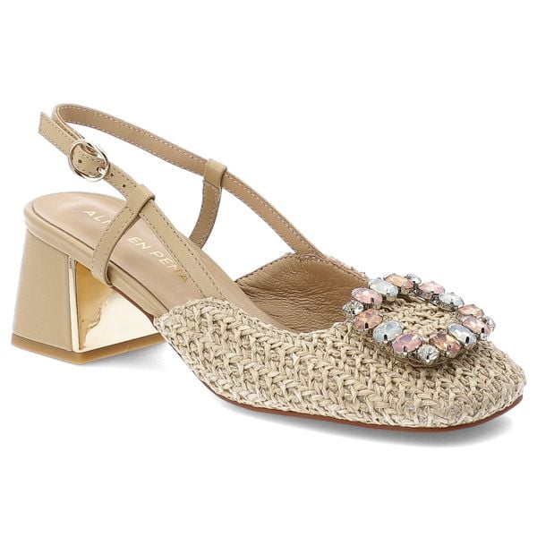 Czółenka damskie Alma En Pena, z zabudowanym przodem wykonane z plecionego materiału osadzone na stabilnym obcasie z regulowanym paskiem wokół kostki efektowna aplikacja, beżowa, V261701
