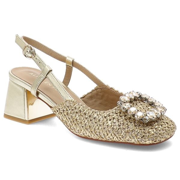 Czółenka damskie Alma En Pena, z zabudowanym przodem wykonane z plecionego materiału osadzone na stabilnym obcasie z regulowanym paskiem wokół kostki efektowna aplikacja, złote, V261701