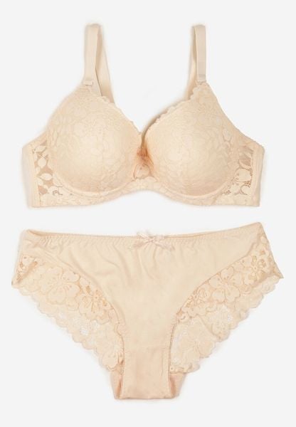 Beżowy Koronkowy Komplet Biustonosz i Majtki Figi w Klasycznym Stylu Ezirene