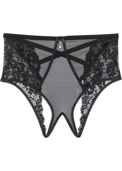 Uwodzicielskie figi z rozcięciem w kroku. Zamień się w uwodzicielkę i oczaruj swojego partnera! Figi z wysoką talią i wycięciem z tyłu. W talii połyskujący element ozdobny. Paski po bokach z delikatnej koronki. Dostępne także w większych rozmiarach.