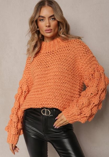 Pomarańczowy Klasyczny Golf z Ozdobnym Splotem na Rękawach Biska