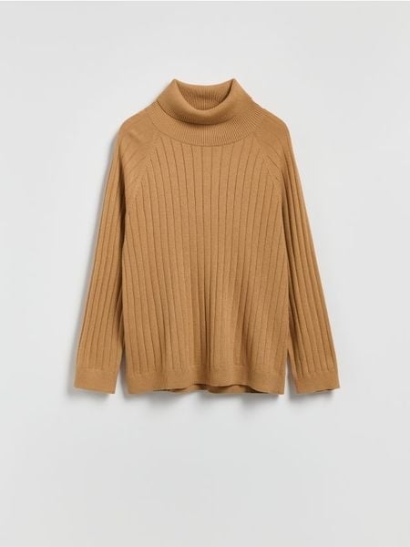 Golf o swobodnym kroju, wykonany z dzianiny z domieszką wełny.