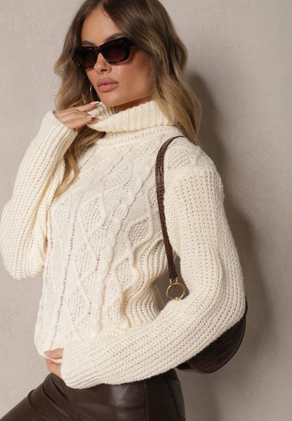 Jasnobeżowy Golf z Wełną ze Ściągaczem i Ozdobnym Splotem Miarenn
