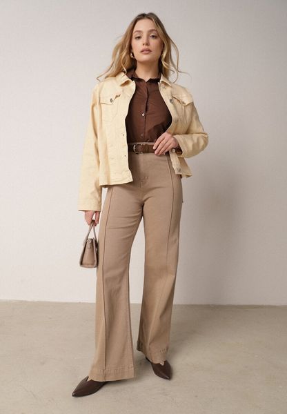 Beżowe Szerokie Jeansy z Bawełny z Wysokim Stanem i Pionowymi Przeszyciami Keperise