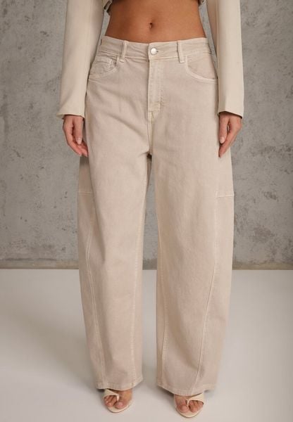 Beżowe Jeansy z Bawełny Typu Balloon High Waist Ozdobione Przeszyciami Eunaris