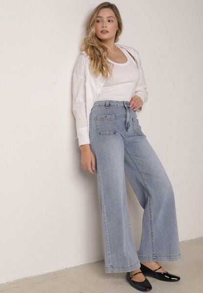 Niebieskie Jeansy Szerokie z Wysokim Stanem z Ozdobnymi Kieszonkami Phinis