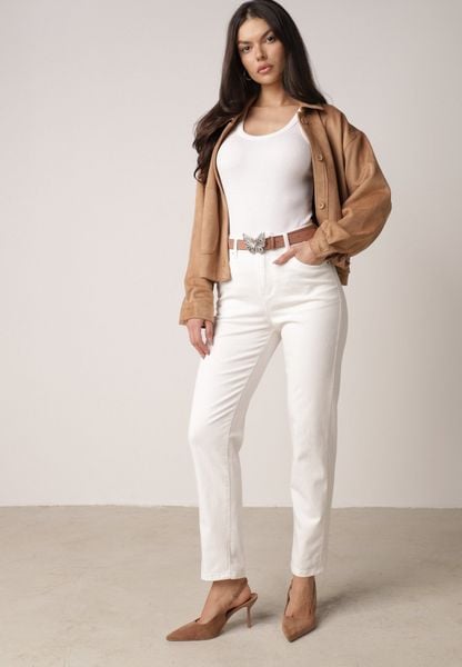 Białe Jeansy Mom Fit z Wiskozą Bawełną i Wysokim Stanem z Paskiem z Motylem Nevilias