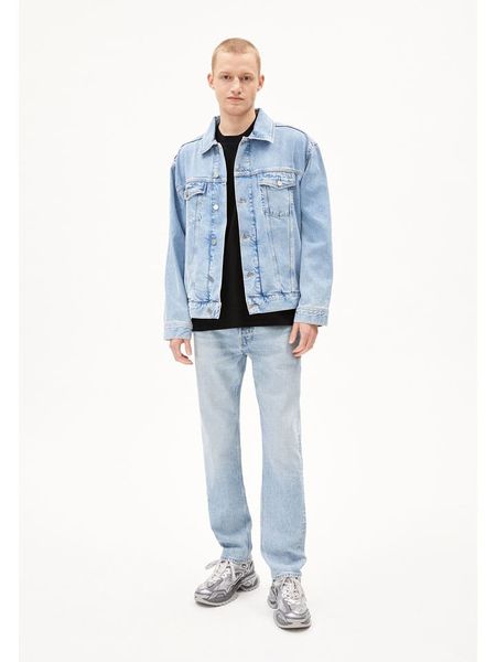 – z bawełny organicznej- wysokość pasa: regular waist- fason: Straight fit- krój nogawek: prosty- zapięcie: guzik i suwak- szlufki na pasek: tak- kieszenie: 5 klasycznych- naszywki: ze skóry syntetycznej- przetarcia: tak