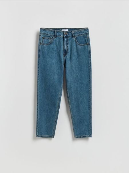 Jeansy typu carrot, wykonane z denimu.