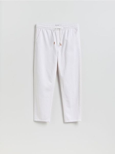 Jeansy typu jogger, wykonane z bawełny, lyocellu i lnu.