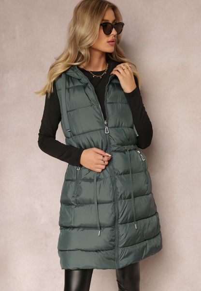 Ciemnozielona Długa Kamizelka Pikowana Dwustronna ze Sznurkami przy Kapturze Frenila