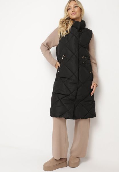 Czarna Pikowana Kamizelka o Długim Kroju ze Stójką i Kieszeniami Avatheia