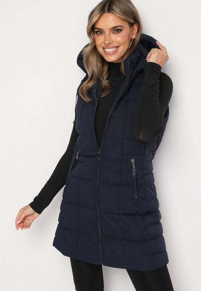 Granatowa Pikowana Kamizelka z Zasuwanymi Kieszeniami i Odpinanym Kapturem Cianefela