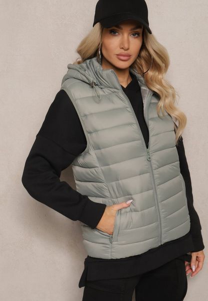 Jasnozielona Taliowana Kamizelka z Pikowanymi Przeszyciami Kieszeniami i Odpinanym Kapturem Ravarielis