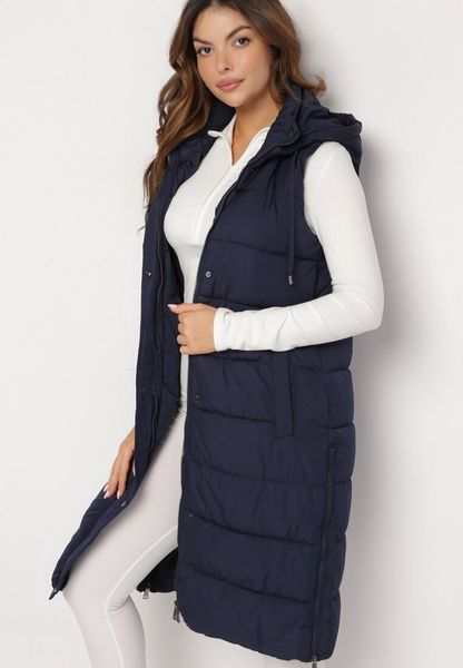 Granatowa Długa Kamizelka Bezrękawnik z Klasycznym Pikowaniem i Kapturem Shin