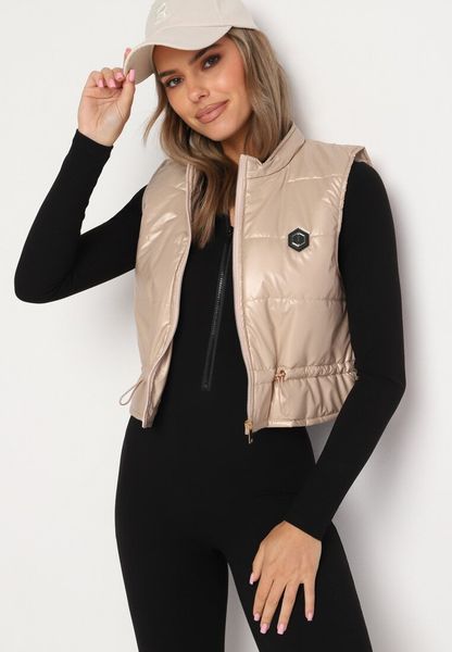 Beżowa Krótka Kamizelka Ozdobiona Naszywką Ściągana w Talii Mevelina