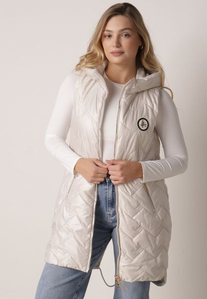 Jasnoszara Przejściowa Kamizelka Pikowana o Długim Kroju z Kapturem i Naszywką Harmaste