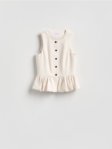 Kamizelka o prostym kroju, wykonana z tkaniny.
