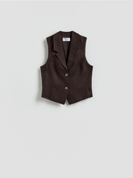 Kamizelka o dopasowanym kroju, wykonana z lnianej tkaniny.