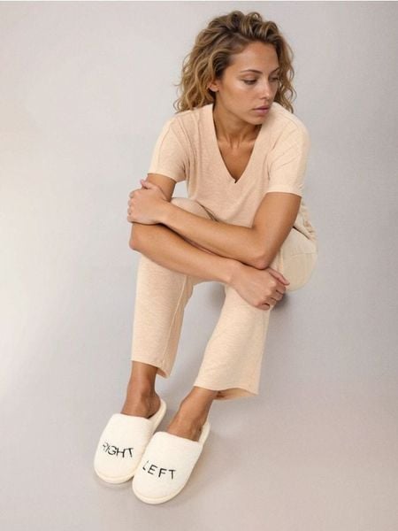 Sinsay – Kapcie ze sztucznym futerkiem i haftowanym napisem – kremowy –