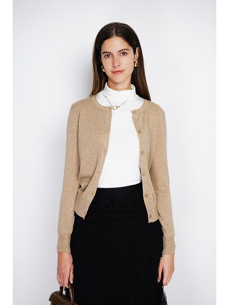 – z dodatkiem kaszmiru- dekolt: okrągły- zapięcie: listwa guzikowa- ściągacz: dekolt, zakończenia rękawów, dolny brzeg- wzór splotu: ścisły- krój: prosty- look: jednokolorowy