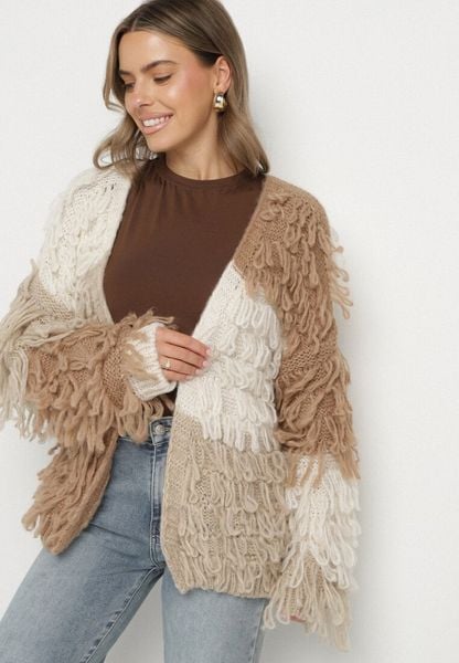 Beżowy Niezapinany Kardigan z Dodatkiem Wełny o Fakturze Imitującej Pióra Lanida