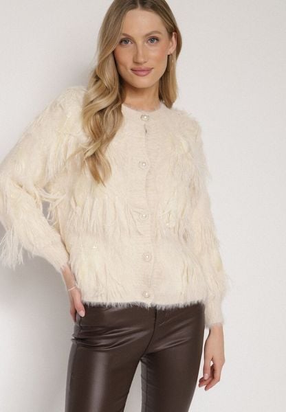 Jasnobeżowy Kardigan z Dzianiny z Wełną Imitującą Pióra z Perłowymi Guzikami Meviatta