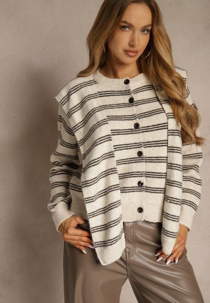 Beżowy Kardigan z Dodatkiem Wełny Zdobiony Wzorem w Paski i Narzutką Fedira