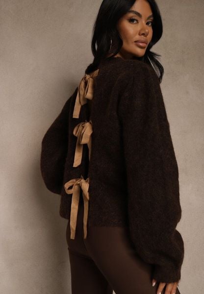 Brązowy Kardigan z Wełną Zdobiony Bufiastymi Rękawami i Wiązaniem na Plecach Tusfina
