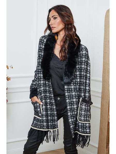 – zapięcie: bez- kieszenie: naszyte- wstawka ze sztucznego futerka: tak- ściągacz: zakończenia rękawów- detale: frędzle- krój: luźny- wzór: kratka- wzór splotu: luźny