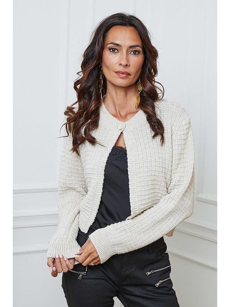 – z dodatkiem wełny- dekolt: okrągły- zapięcie: guzik- ściągacz: dekolt, zakończenia rękawów, dolny brzeg- krój: luźny- look: jednokolorowy- wzór splotu: luźny