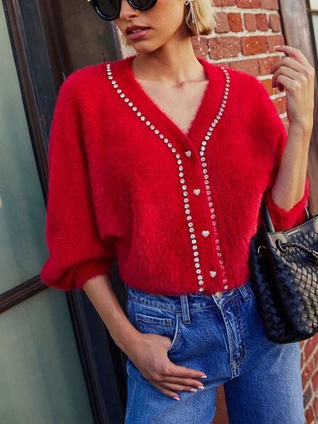 – dekolt: V- zapięcie: listwa guzikowa- ściągacz: zakończenia rękawów, dolny brzeg- detale: ozdobne kamyczki- krój: prosty- look: jednokolorowy