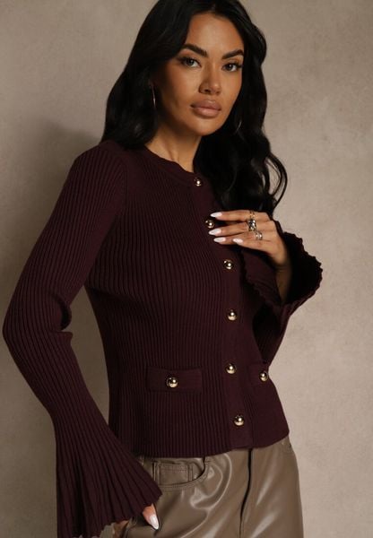 Bordowy Elegancki Prążkowany Kardigan z Wiskozą Guzikami i Rozszerzanymi Rękawami Otila