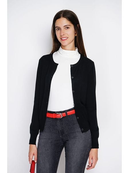 – z dodatkiem kaszmiru- dekolt: okrągły- zapięcie: listwa guzikowa- ściągacz: dekolt, zakończenia rękawów, dolny brzeg- wzór splotu: ścisły- krój: prosty- look: jednokolorowy