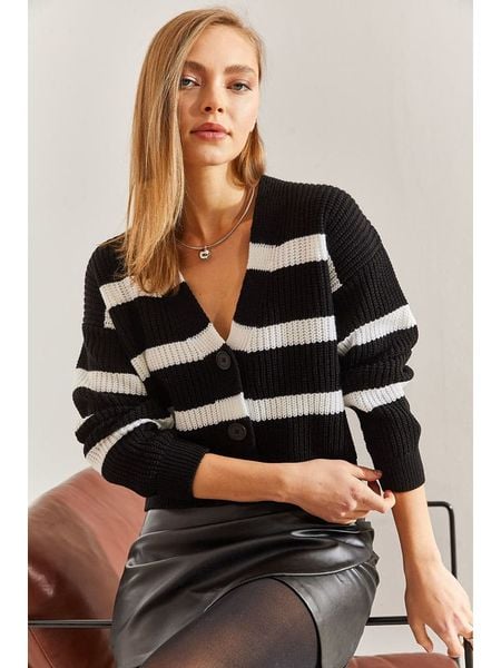 – dekolt: V- zapięcie: listwa guzikowa- wzór splotu: luźny- krój: luźny- wzór: paski