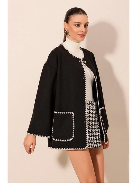 Sweter damski w czarno-białe paski rozpinany z dodatkiem kaszmiru Stripalia 906