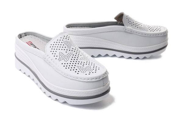 Klapki damskie. Naturalna skóra. Ażurowa cholewka. Miękka, skórzana, częściowo perforowana wkładka. Wygodny, stabilny koturn. Tęgość G.