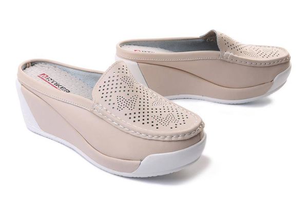 Klapki damskie. Naturalna skóra. Ażurowa cholewka. Miękka, skórzana, częściowo perforowana wkładka. Wygodny, stabilny koturn. Tęgość G.