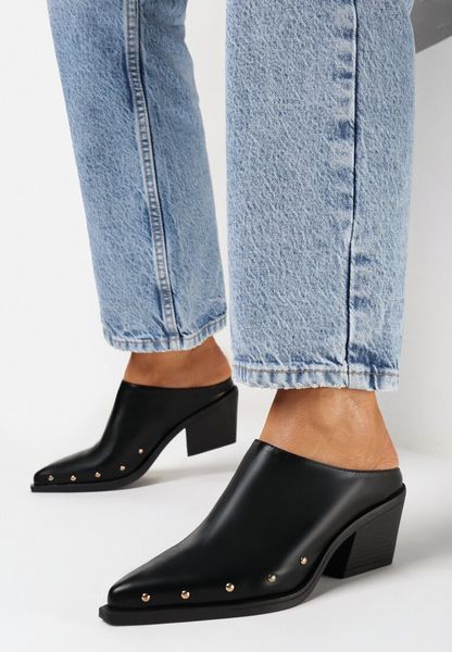 Czarne Klapki Mule na Stożkowym Obcasie z Nitami na Szpiczastym Nosku Ielara