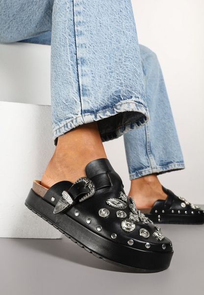 Czarne Rockowe Klapki Mule Zdobione Klamrami i Biżuteryjnymi Aplikacjami Tidanoriel