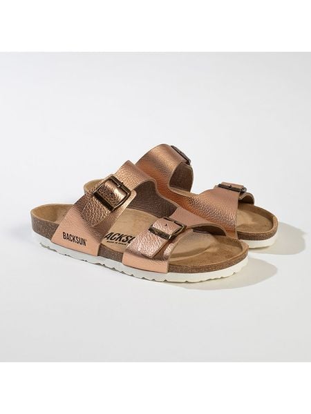 – materiał wierzchni ze skóry syntetycznej- zapięcie: sprzączka- noski: otwarte- skórzana wkładka: ergonomicznie formowana- powierzchnia: z metalicznym połyskiem – podeszwa: antypoślizgowa- wyprodukowano w Hiszpanii