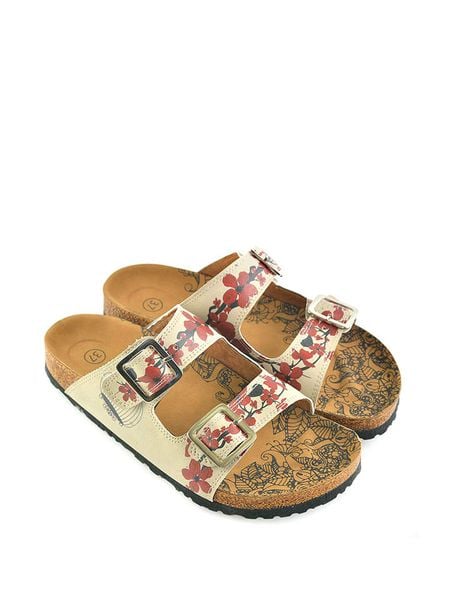 – materiał wierzchni ze skóry syntetycznej- zapięcie: sprzączka- noski: otwarte- powierzchnia: wzorzysta- wkładka: ergonomicznie formowana- podeszwa: antypoślizgowa