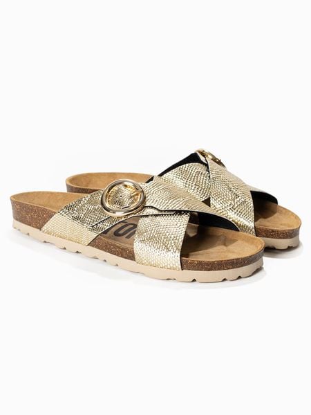 – powierzchnia: z metalicznym połyskiem- zapięcie: sprzączka- noski: otwarte- skórzana wkładka: ergonomicznie formowana- podeszwa: profilowana