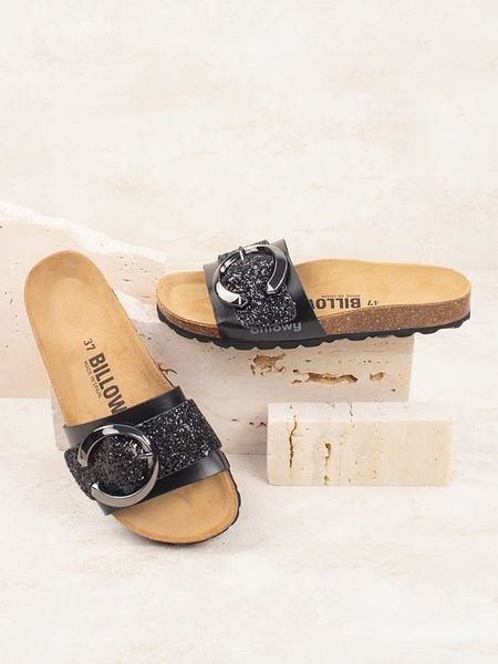 – noski: otwarte- skórzana wkładka: tak- detale: połyskujące elementy – podeszwa: antypoślizgowa