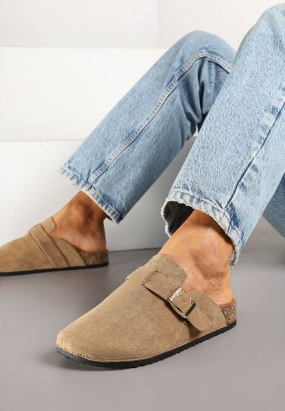 Ciemnobeżowe Klapki z Ozdobnym Paskiem i Klamrą Calevelis
